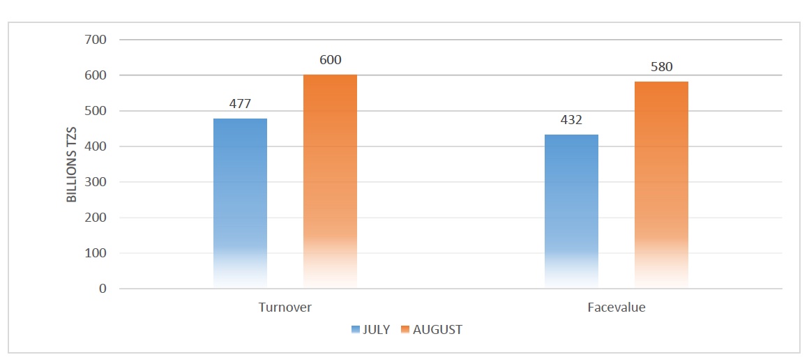 The secondary bond market registered robust activity in August 2025, with turnover climbing to TZS 600.07 billion, 26% increase from July’s TZS 477.24 billion. Face value traded also rose by 34% to TZS 580.22 billion. This contrasts with August 2024, when turnover was only TZS 112.19 billion, underscoring the rapid growth in fixed income participation.